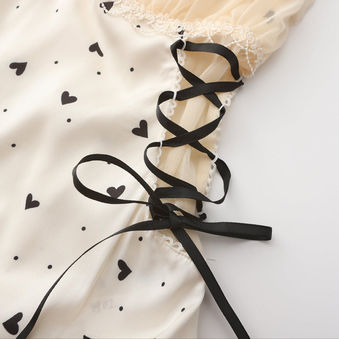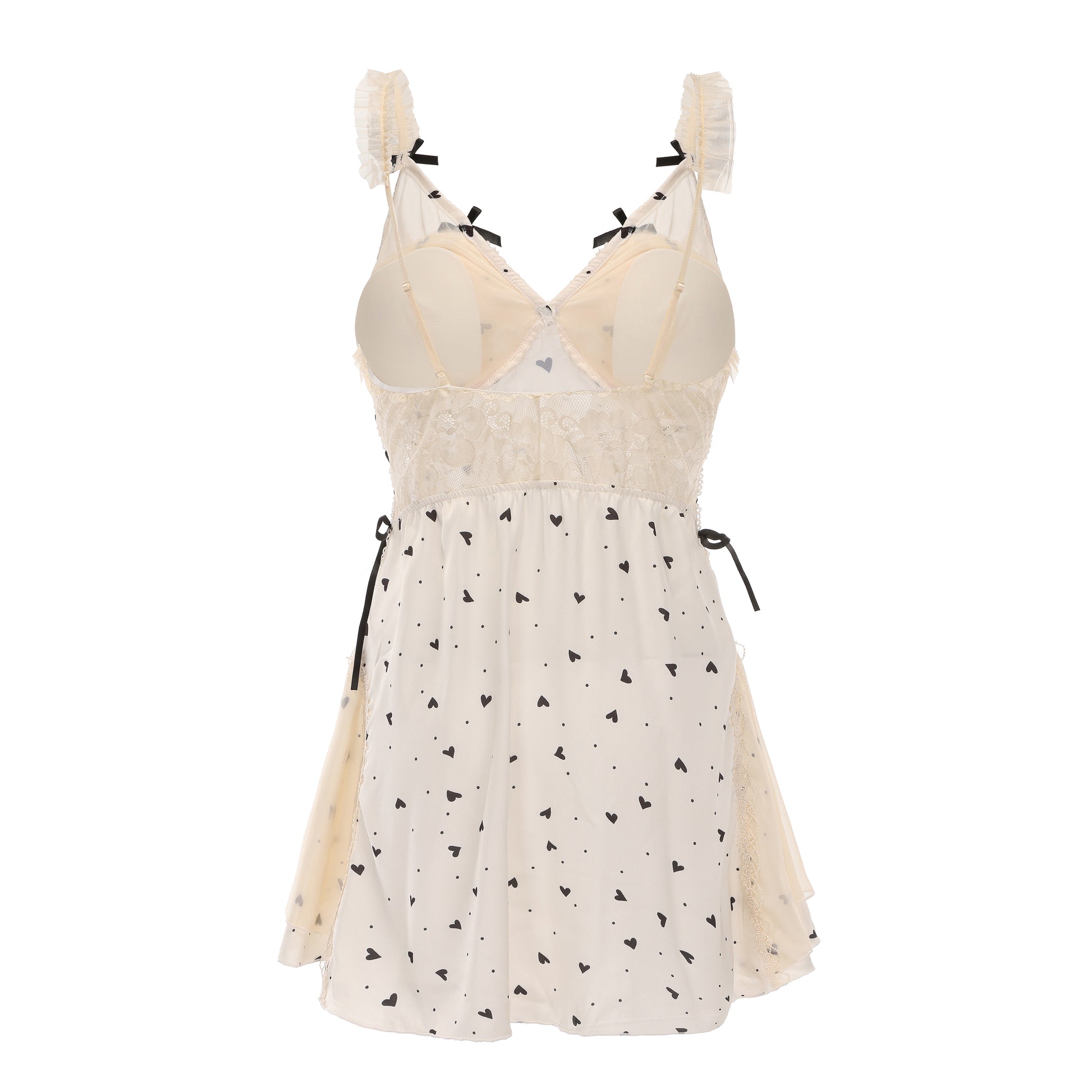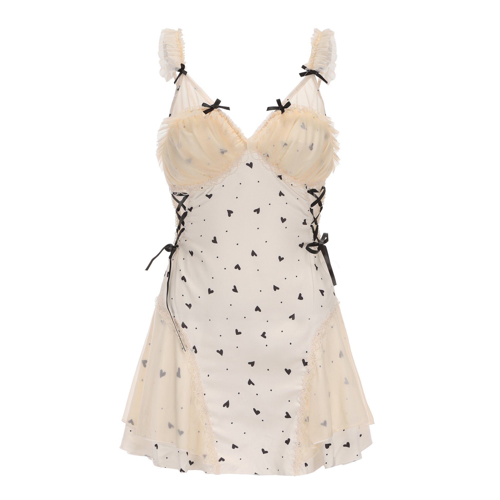 Crafted from soft satin in a gentle light yellow shade, this babydoll-style sleep dress blends sweetness and sensuality. The padded cups offer light support, while ruffled straps and velvet bows elevate the feminine charm. Lace-up sides flatter your shape, and the flared hem adds movement and softness — perfect for intimate evenings or feeling beautiful for yourself.