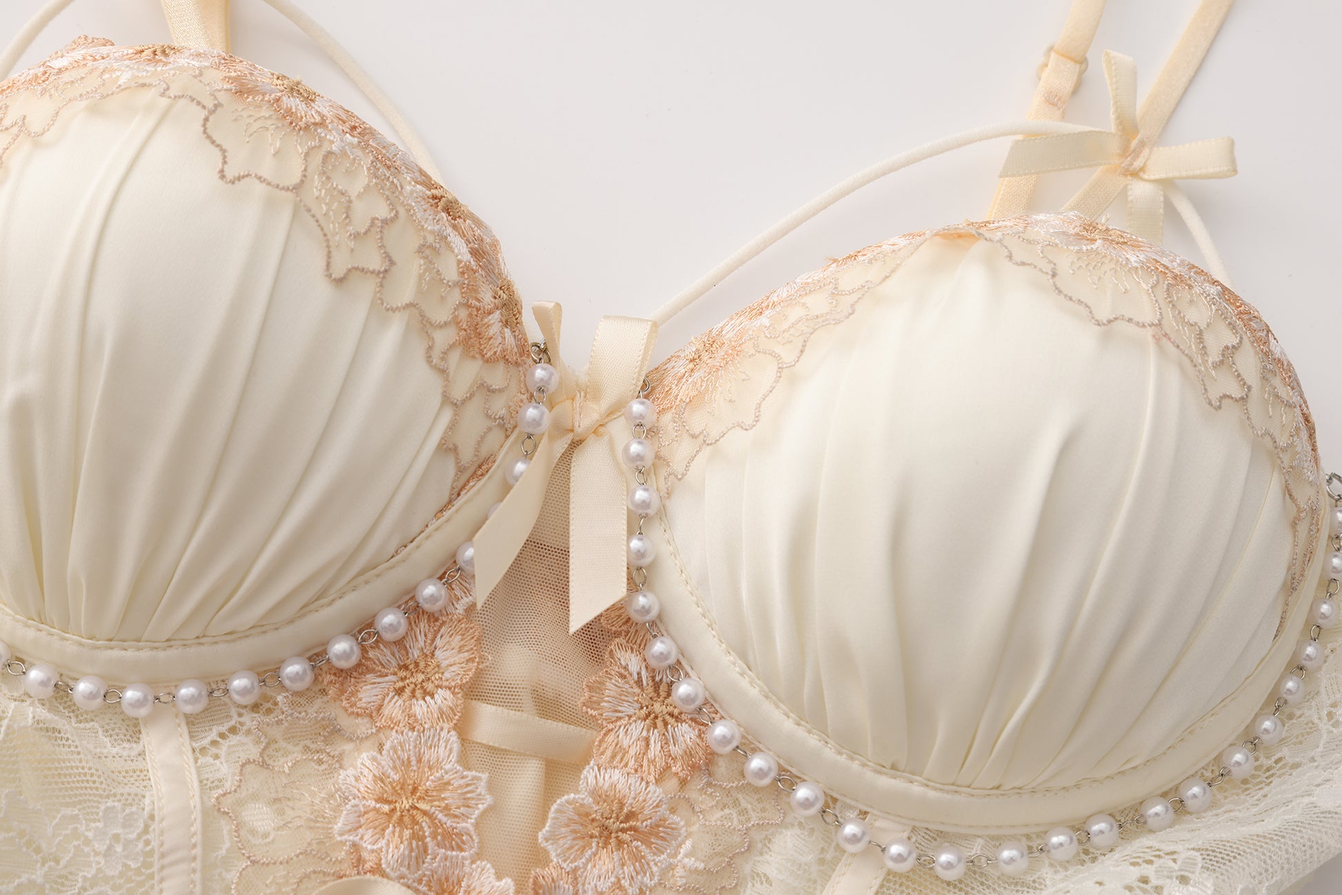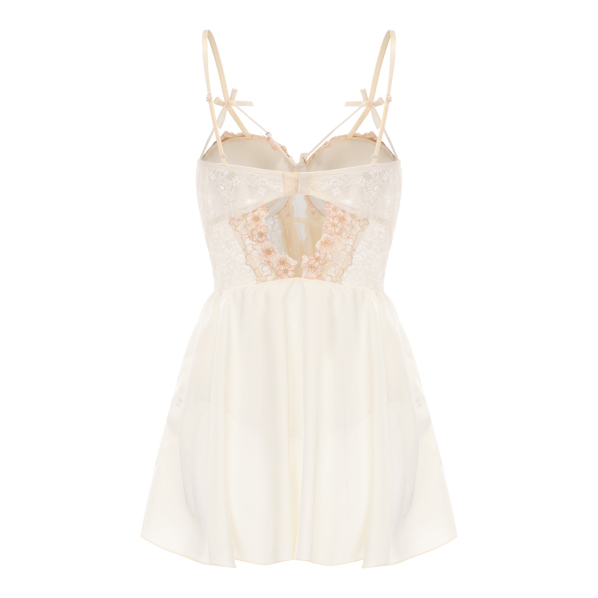 Softly radiant in light yellow satin, this lingerie dress blends romantic elegance with flirtatious charm. The molded cups feature built-in padding and dainty bows, while a pearl chain detail beneath the bust adds a touch of delicate glamour. The sheer lace bodice is adorned with floral embroidery and corset-style lacing. A flared hem enhances movement, perfect for cozy nights or confident expression.