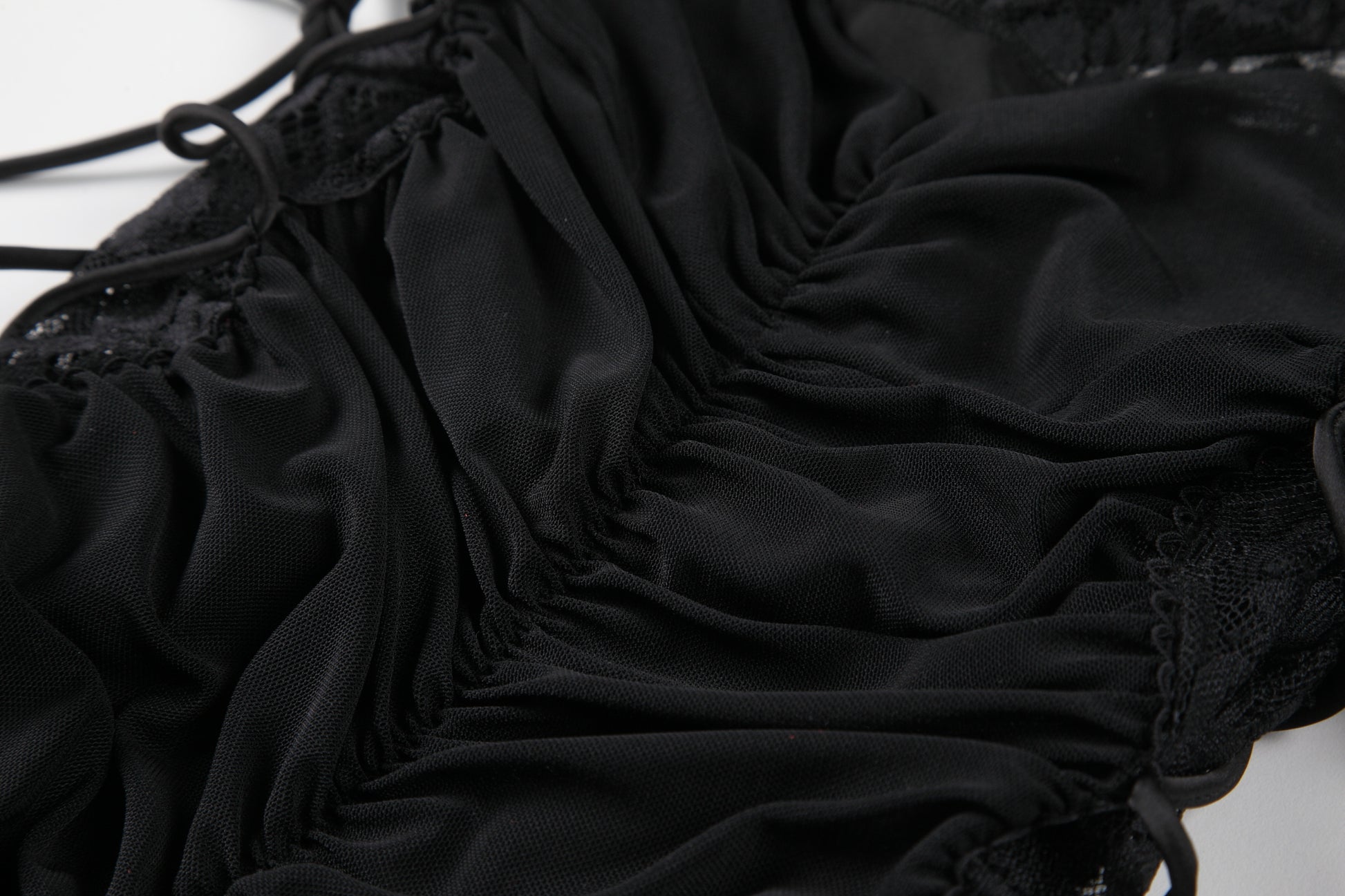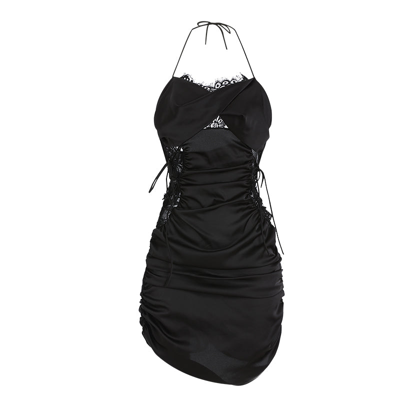 This black satin sleep dress features a seductive lace panel at the bust and a flattering ruched body. Adjustable halter ties and side drawstrings allow for a customized fit, enhancing curves while offering comfort.The sheer back mesh adds a hint of allure, making it perfect for intimate evenings or bold self-expression.