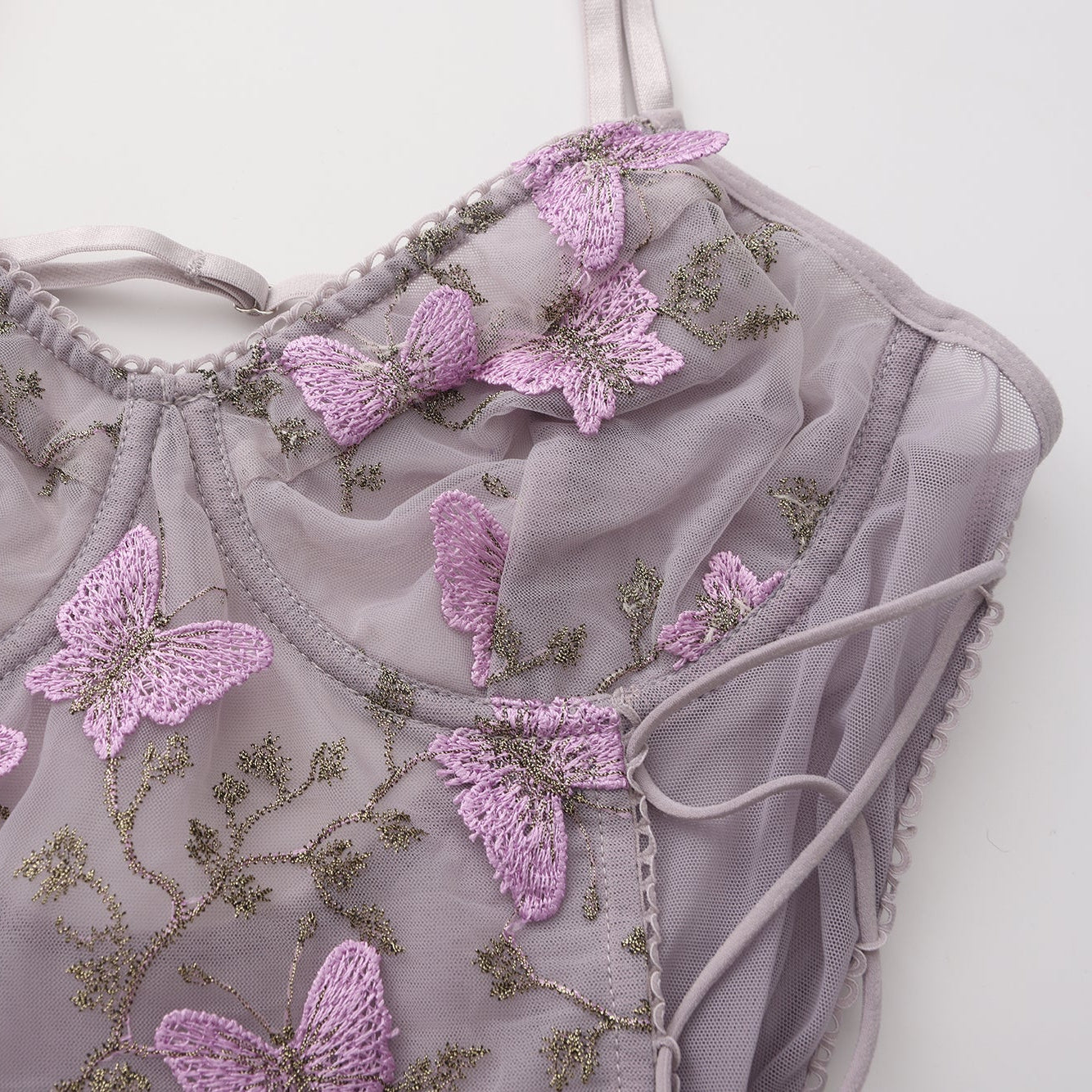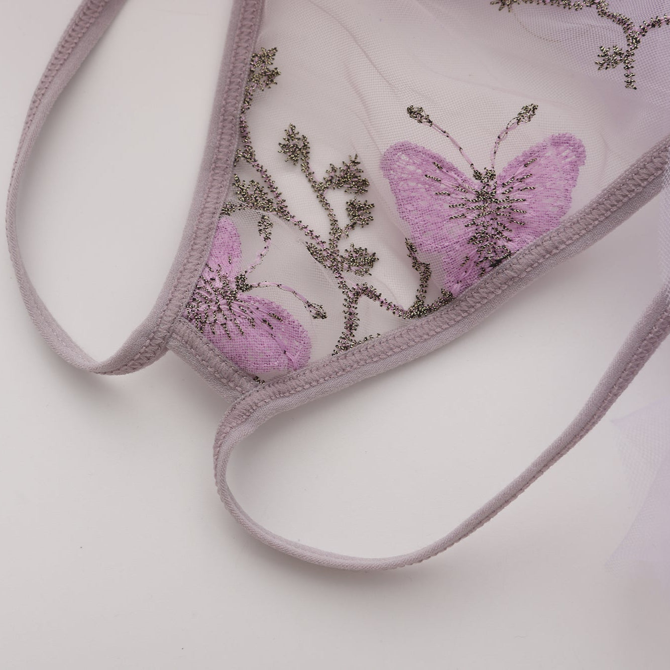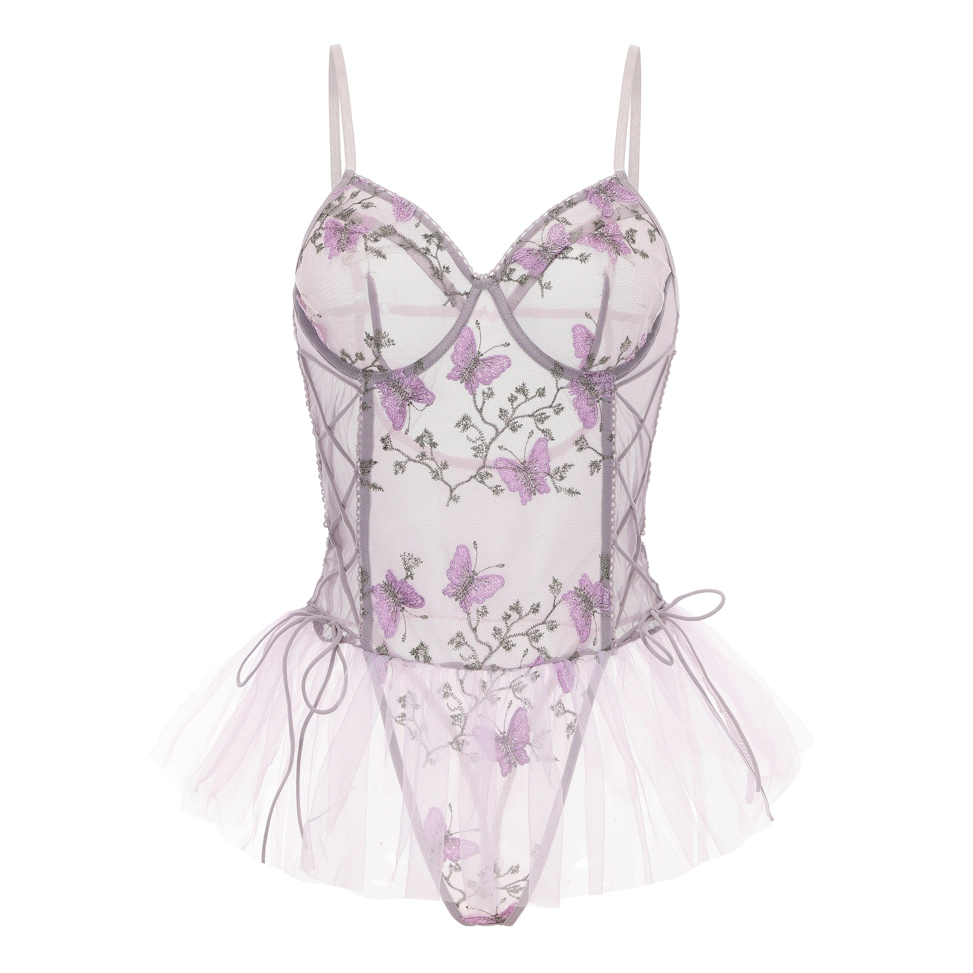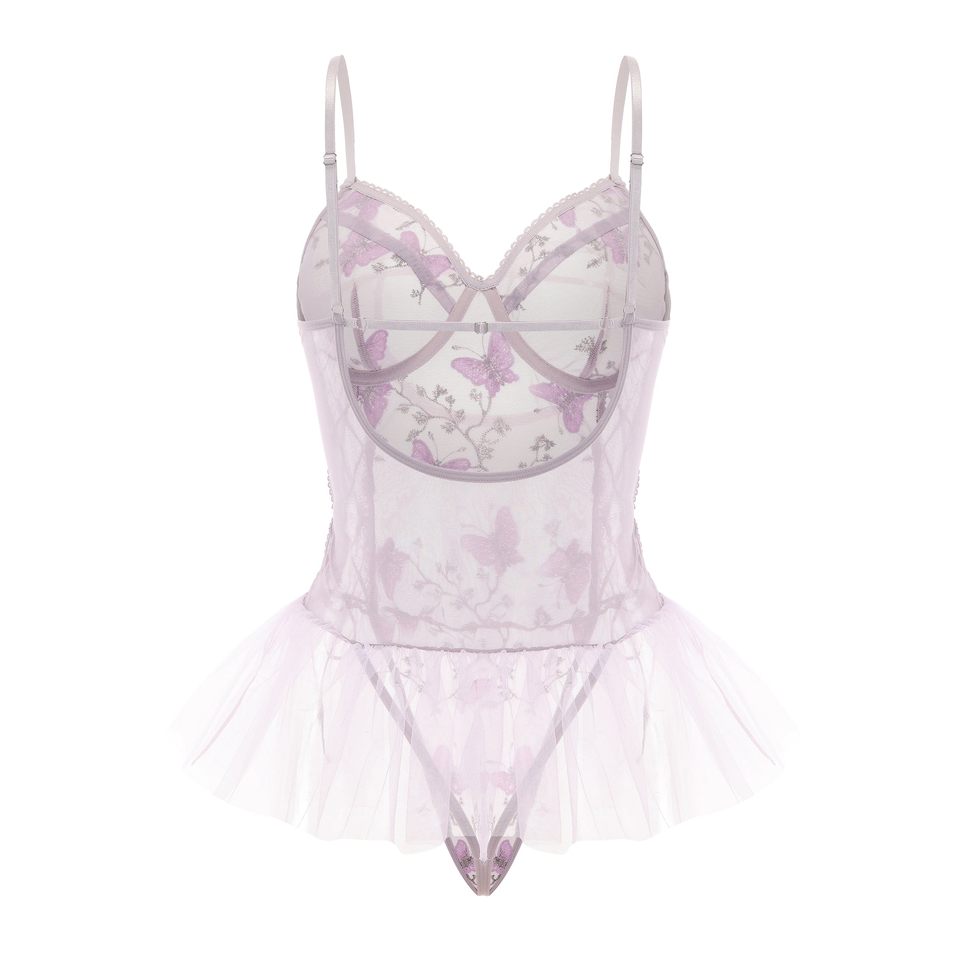 This sheer lavender mesh bodysuit blends delicate floral embroidery with a flirty tutu-style hem. The bodice features soft contour lines, adjustable straps, and an open back with a plunging scoop. Lightweight and breathable, it’s perfect for layering or for nights when you want to feel effortlessly alluring.