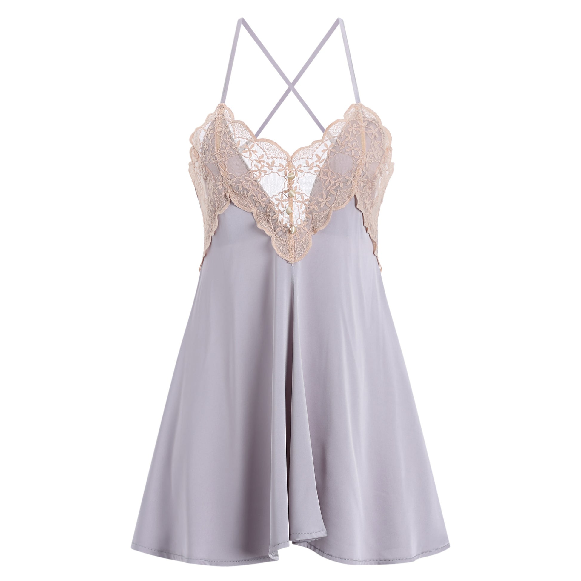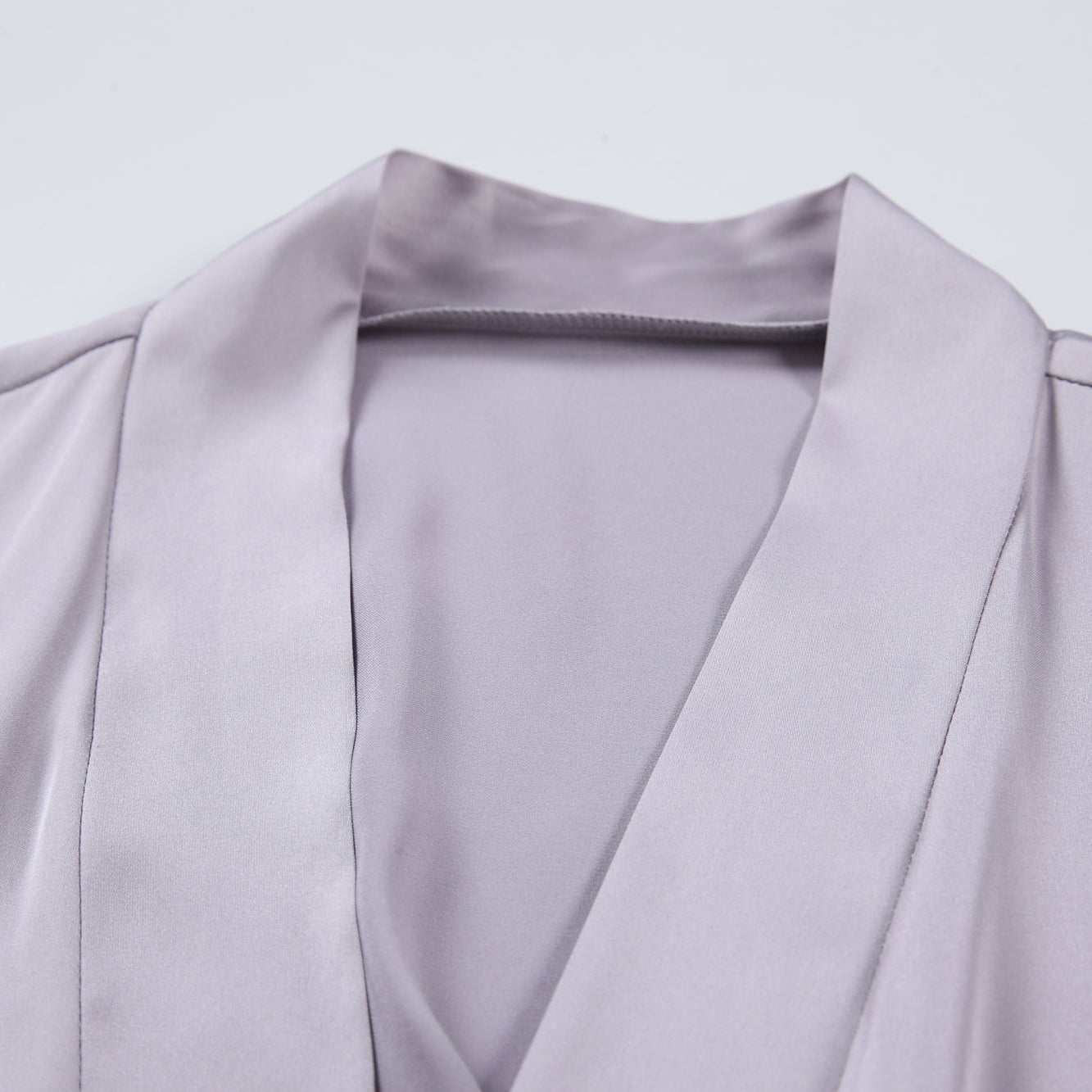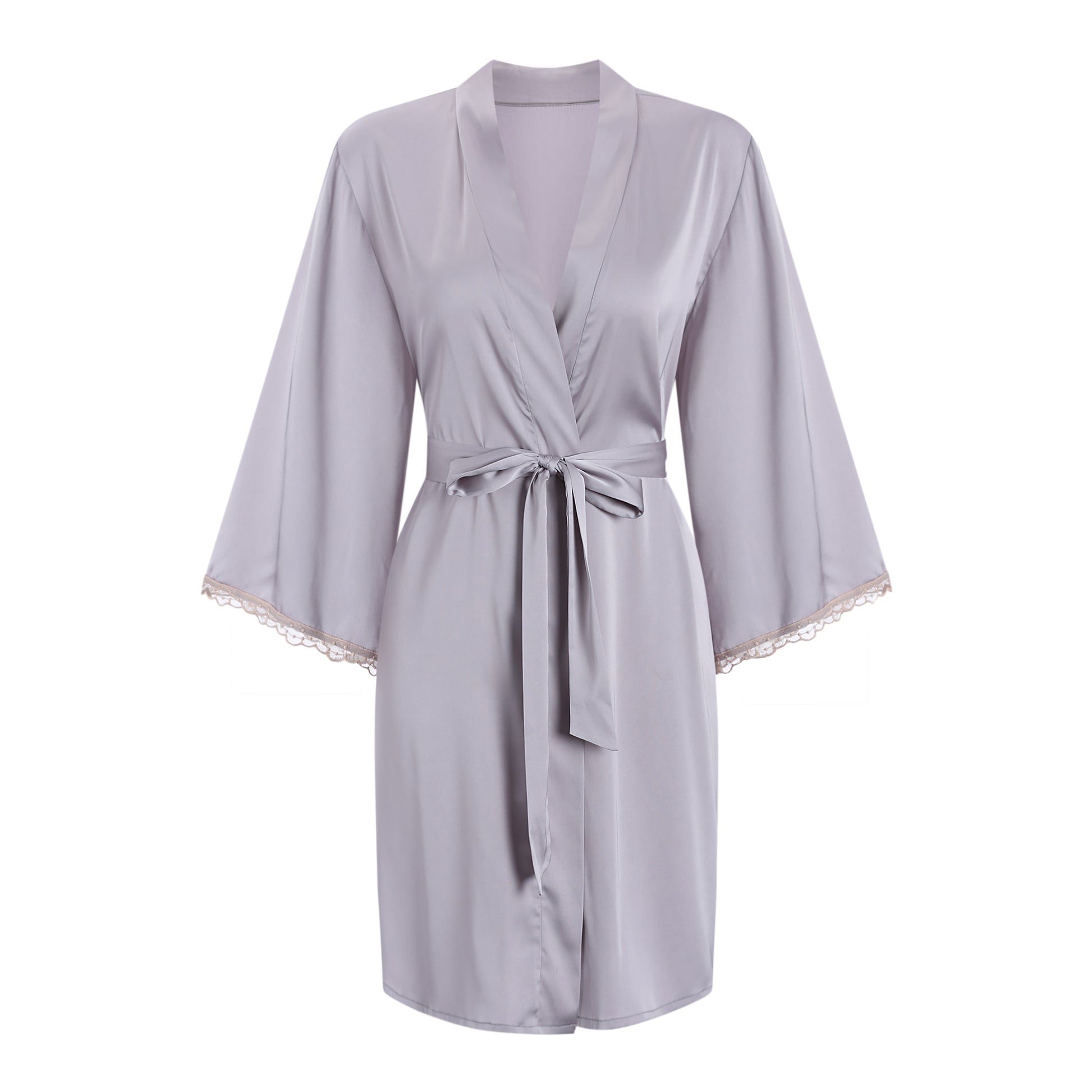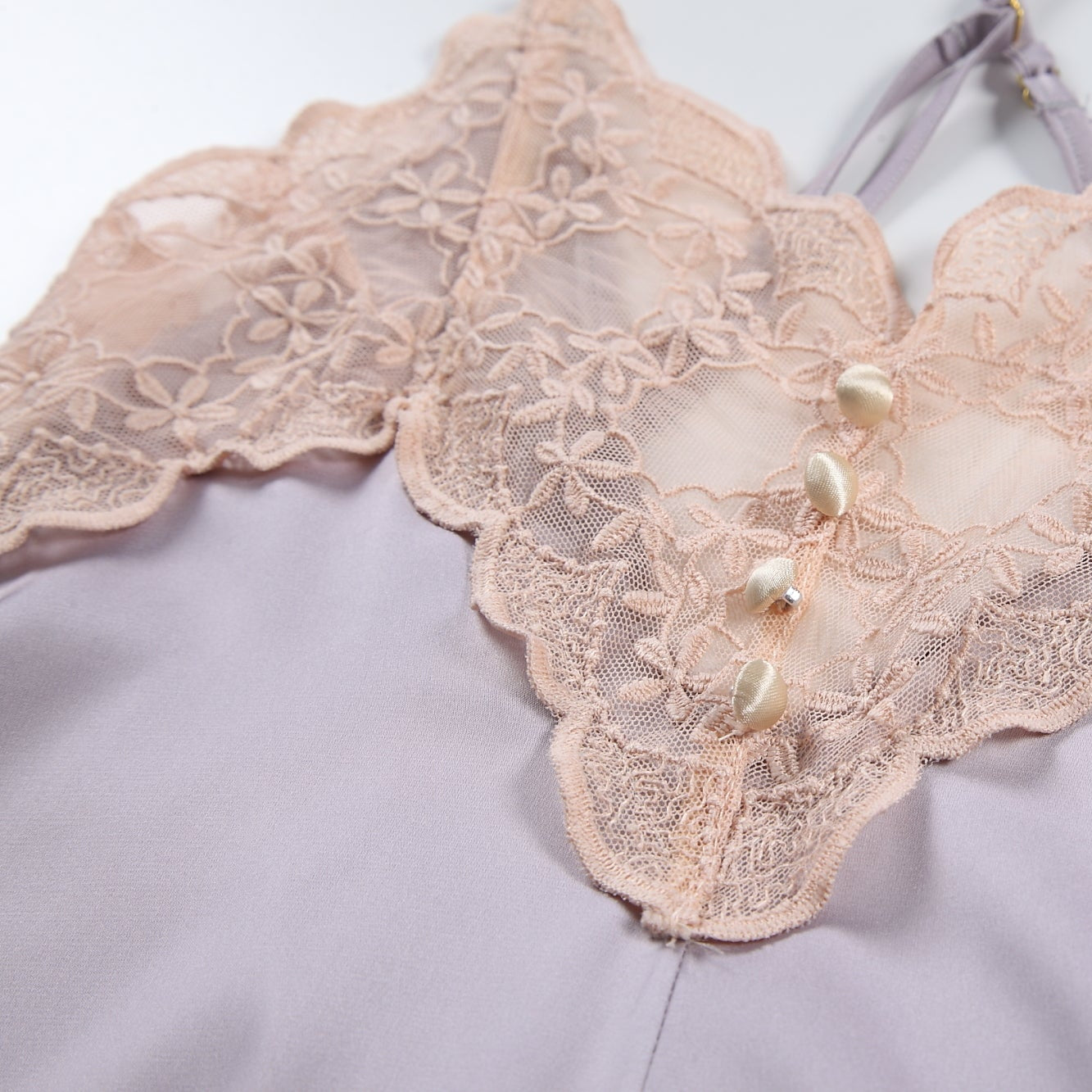 Wrap yourself in soft serenity with this lilac two-piece sleepwear set. The silky satin cami dress features delicate beige lace along the neckline, crisscross straps, and a flared silhouette that flows with every movement. Paired with a matching robe featuring wide sleeves, a waist tie, and lace trim at the cuffs and hem, this set is perfect for slow mornings, relaxed evenings, or simply feeling pretty at home.