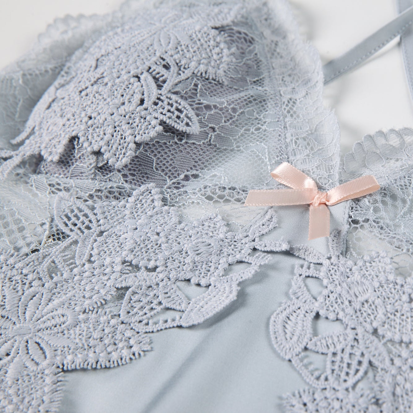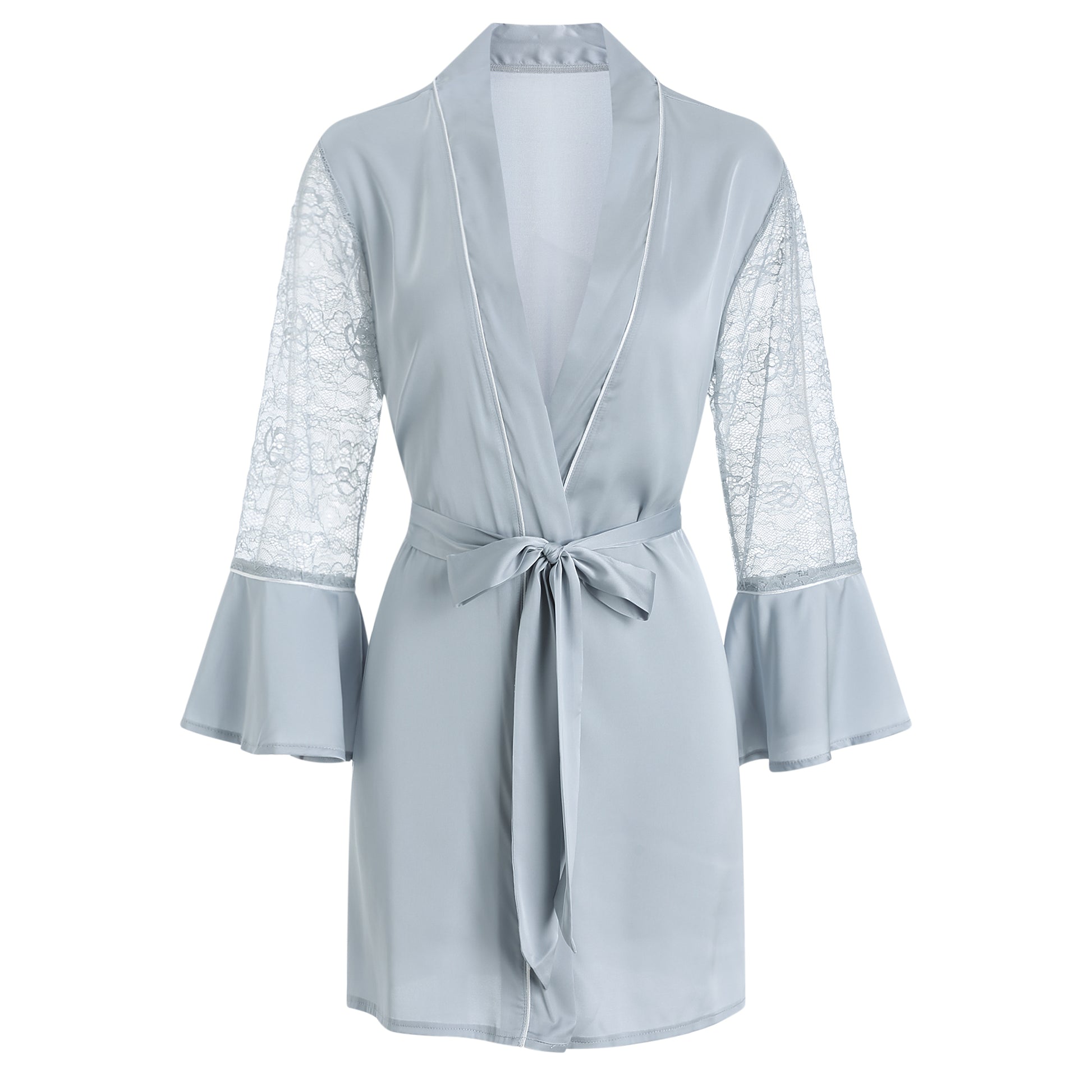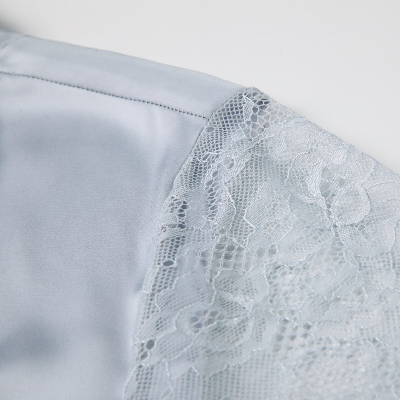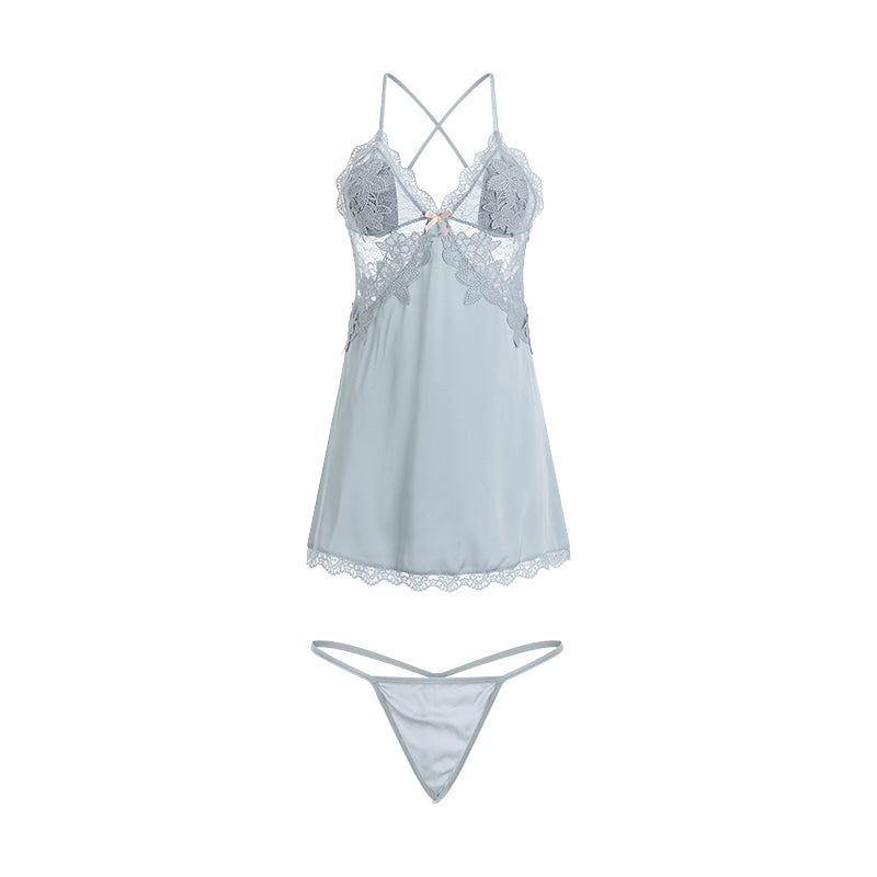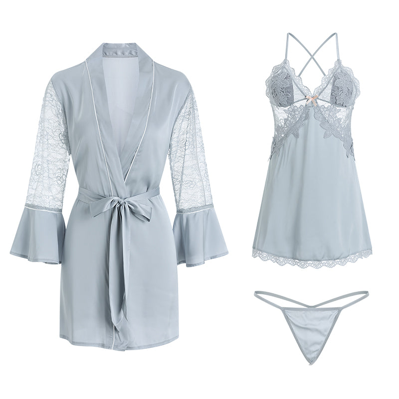 This sky blue satin sleepwear collection offers three elegant pieces designed to be worn alone or together. The lace-trimmed slip dress features a crisscross back and flowing silhouette. The matching robe includes flared lace sleeves and a tie waist, perfect for layering. The coordinating thong completes the look with a minimal touch.