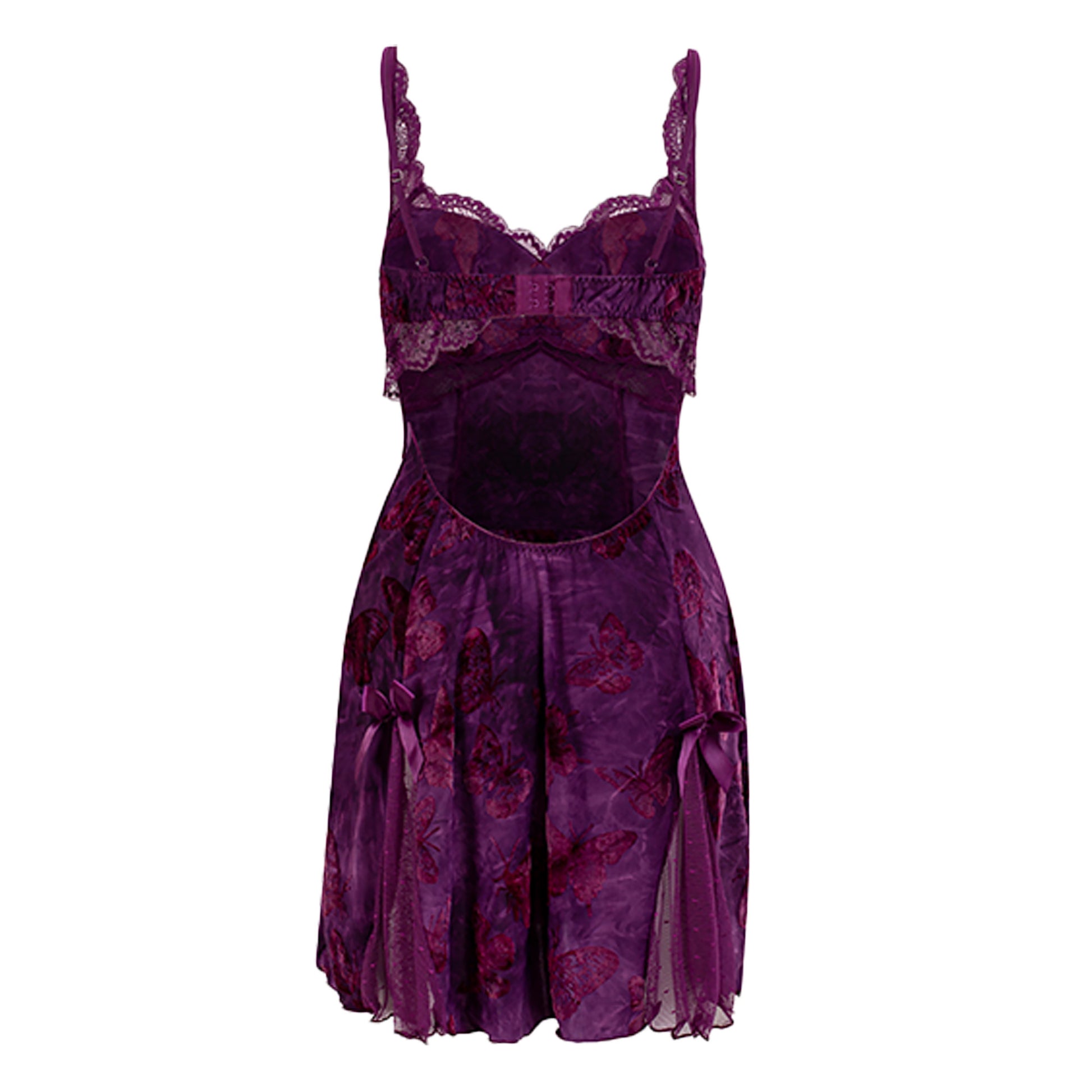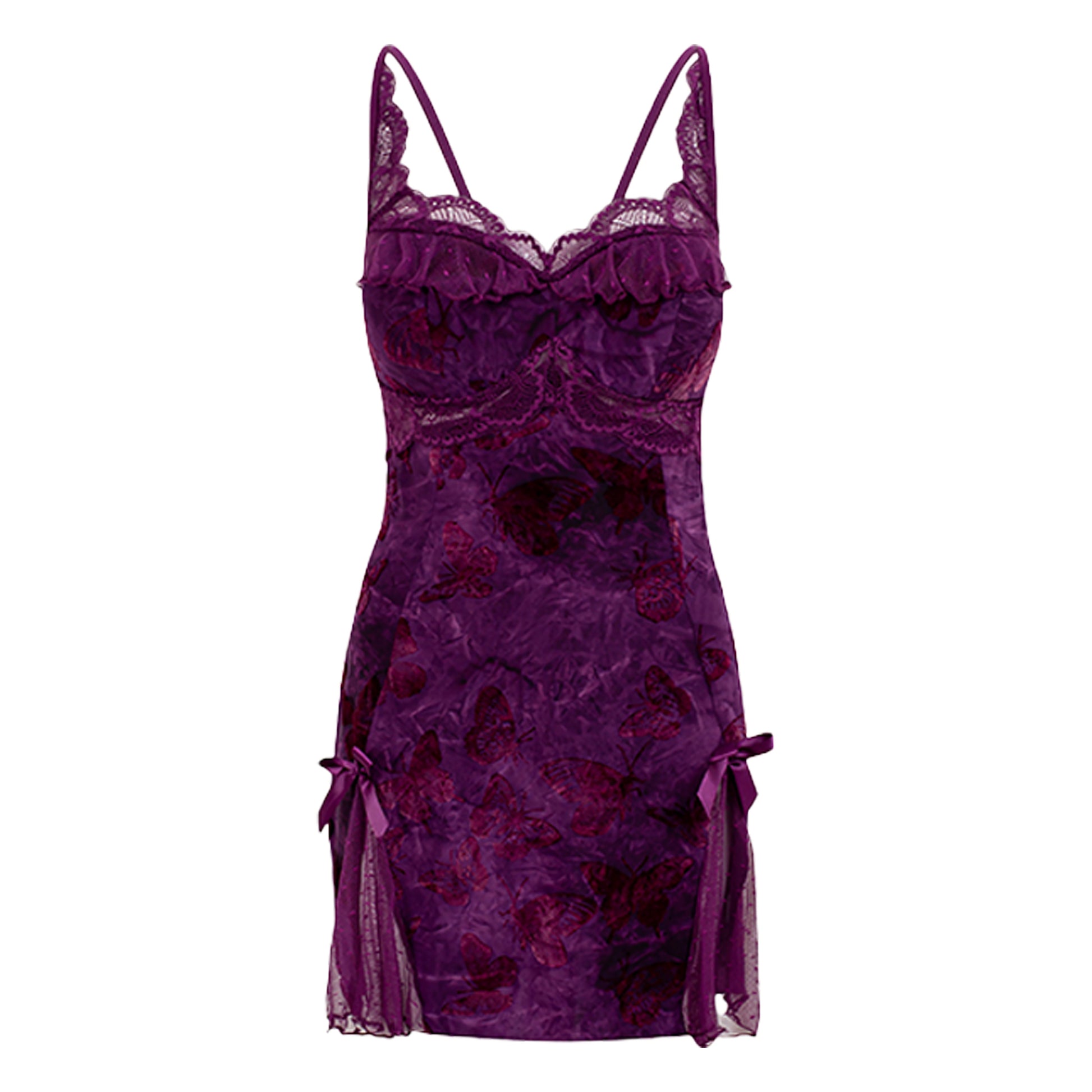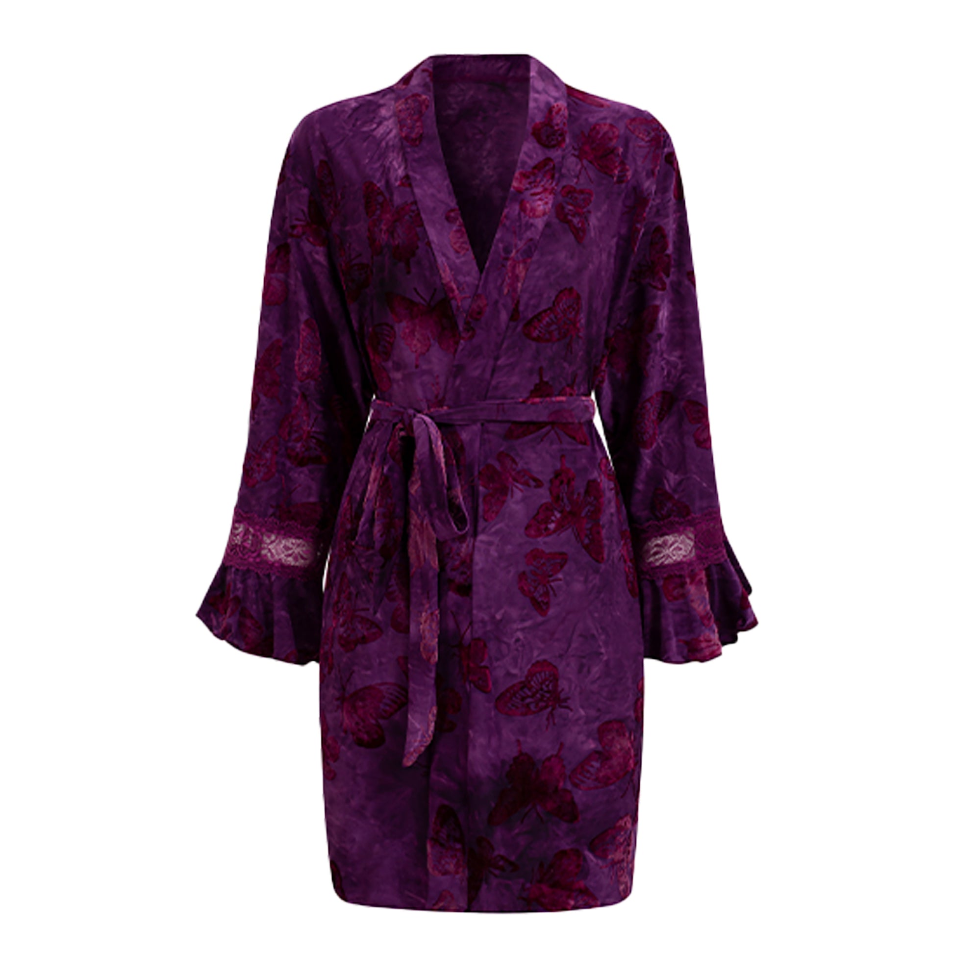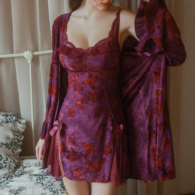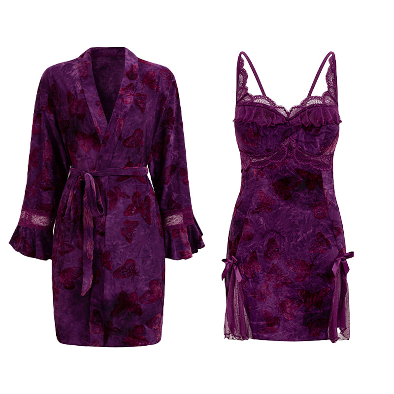 Elevate your evening routine with this statement-making sleepwear set, featuring a rich purple base adorned with velvet flocked butterfly prints. The slip dress includes lace-trimmed cups, adjustable straps, and sheer mesh bows at the sides for a romantic finish. The matching robe echoes the same dreamy texture, complete with wide sleeves and a self-tie belt. A bold blend of sensuality and elegance for nights that deserve more.