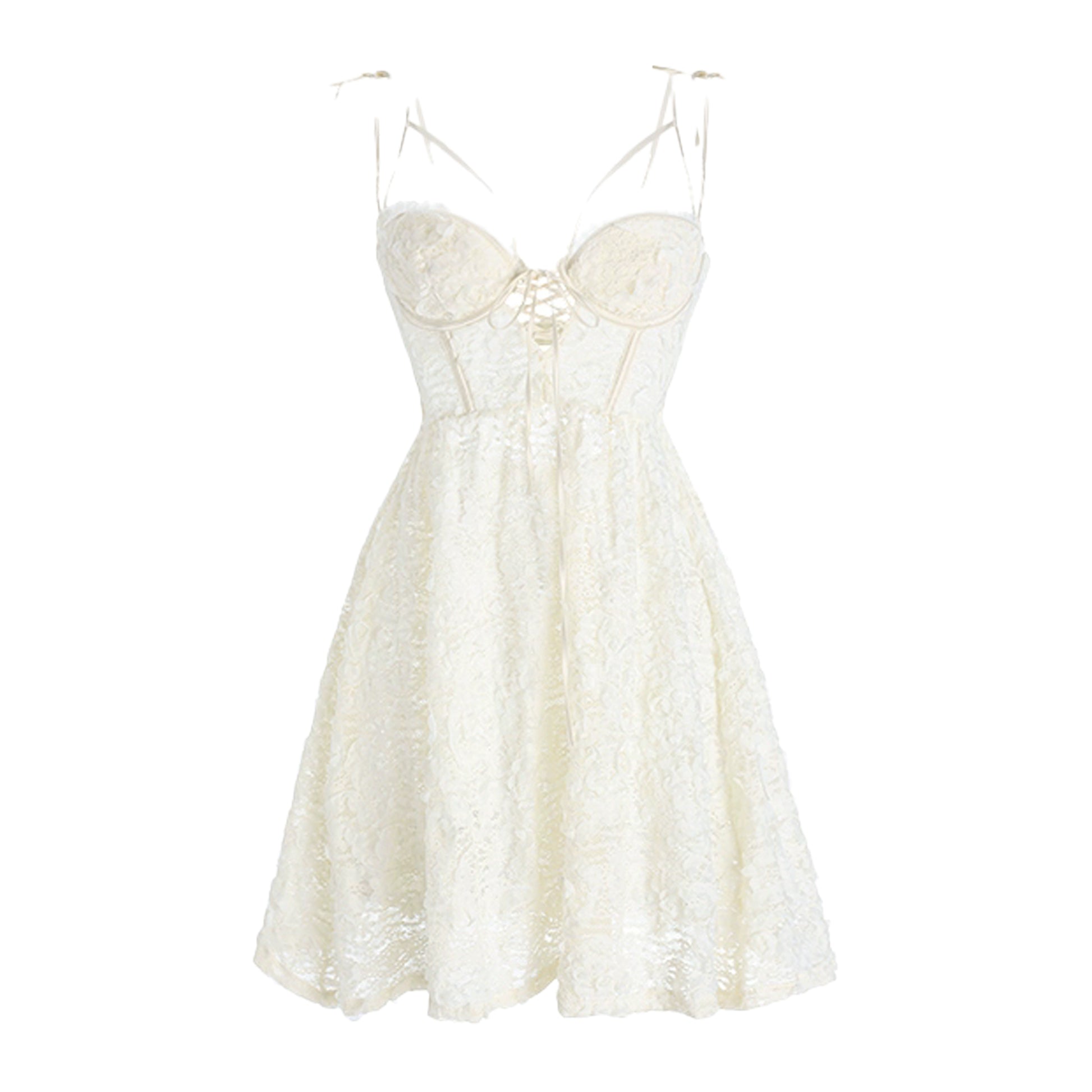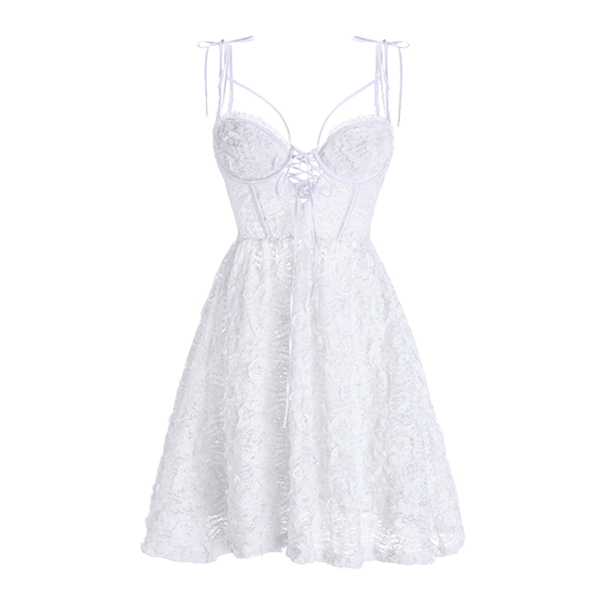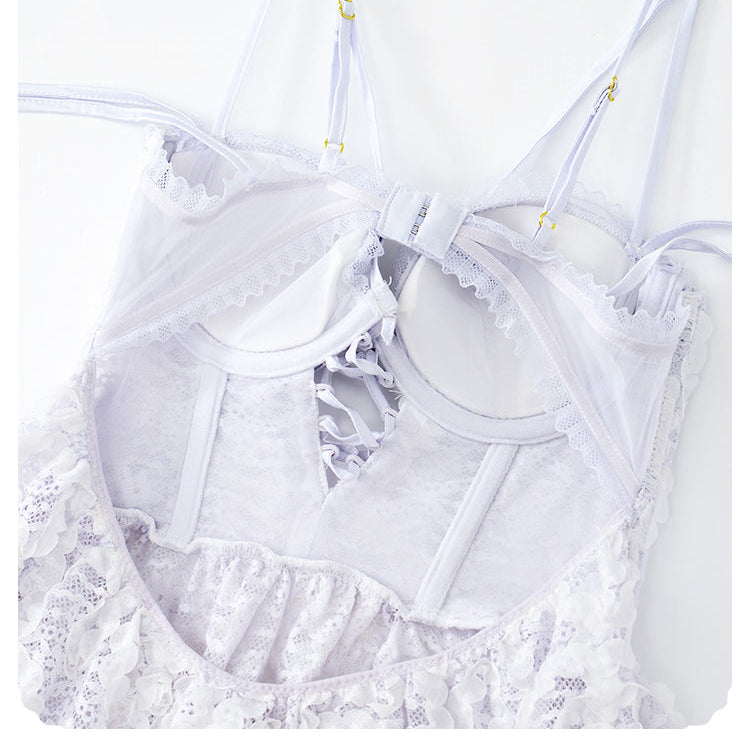 A dreamy piece crafted for versatility, this slip dress blends romantic detail with structural elegance. The bodice is sculpted with soft underwire for gentle shaping, while delicate petal lace overlays add texture and femininity. Finished with a lace-up front and shoulder-tie straps, it effortlessly transitions from bedroom elegance to outerwear statement. Wear it solo or layered with a blazer for a bold, feminine silhouette.