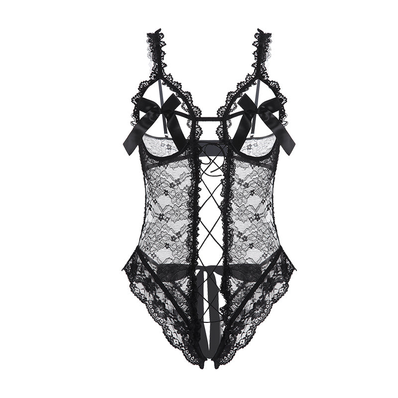 This black lace bodysuit turns up the heat with an all-over floral mesh, open cups adorned with oversized satin bows, and intricate criss-cross lace-up detailing along the front. The scalloped trim adds a romantic finish, while the open-crotch design brings playful freedom to intimate moments. Adjustable shoulder straps ensure a flattering fit that frames your curves just right.