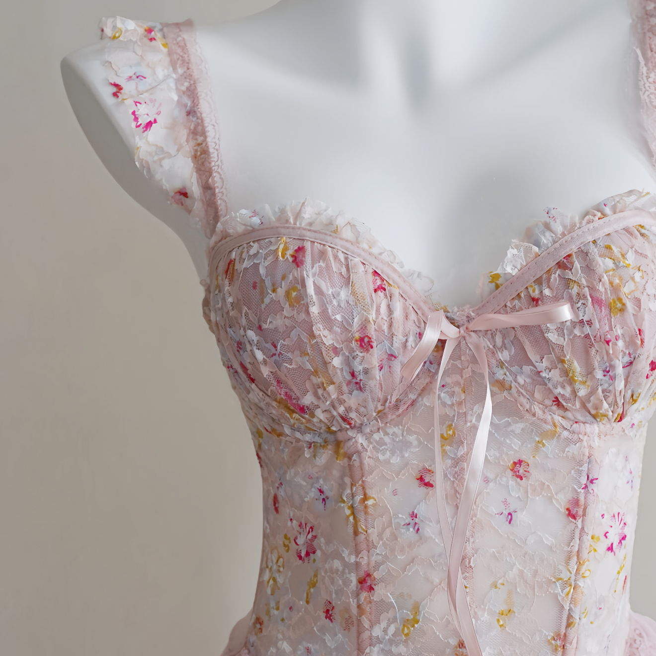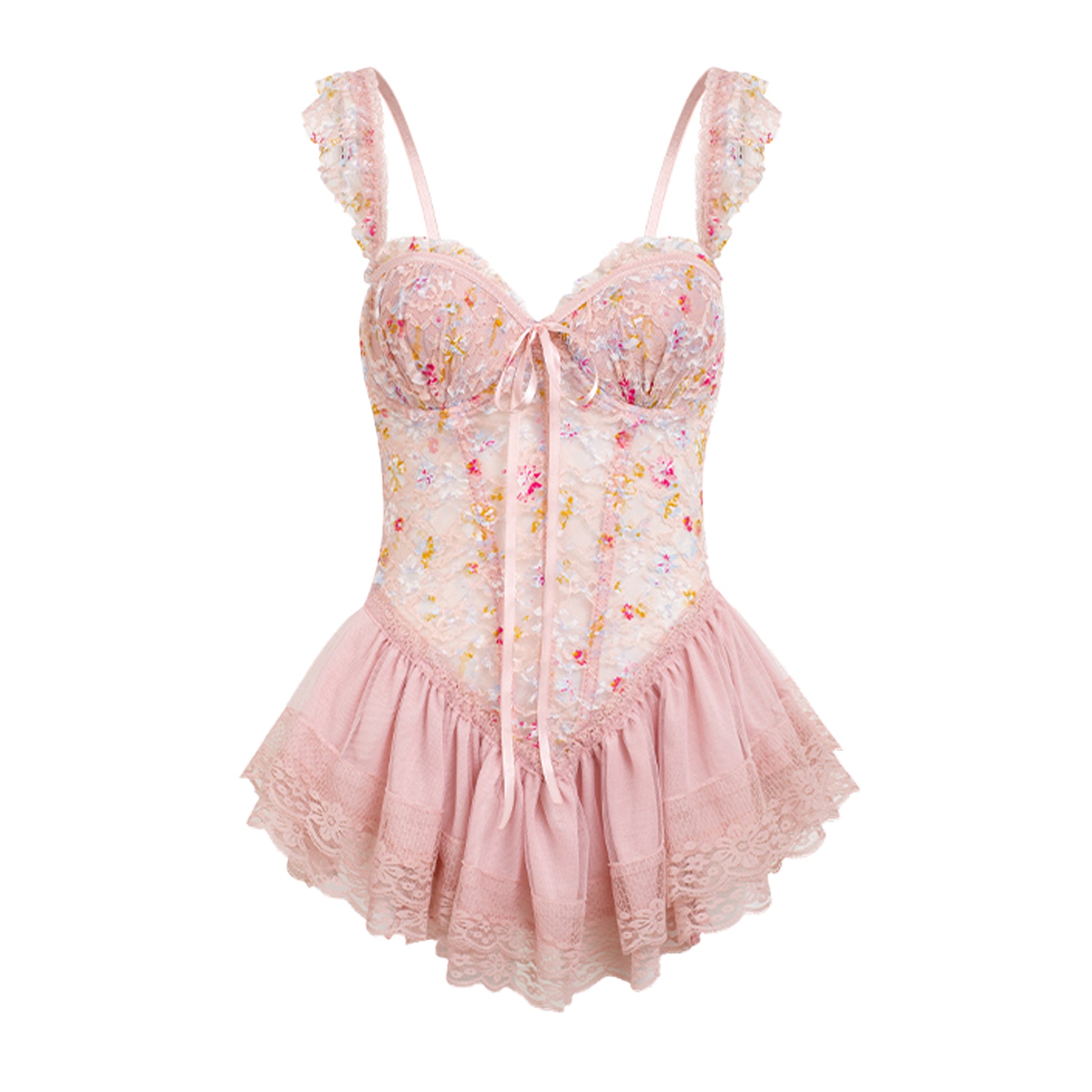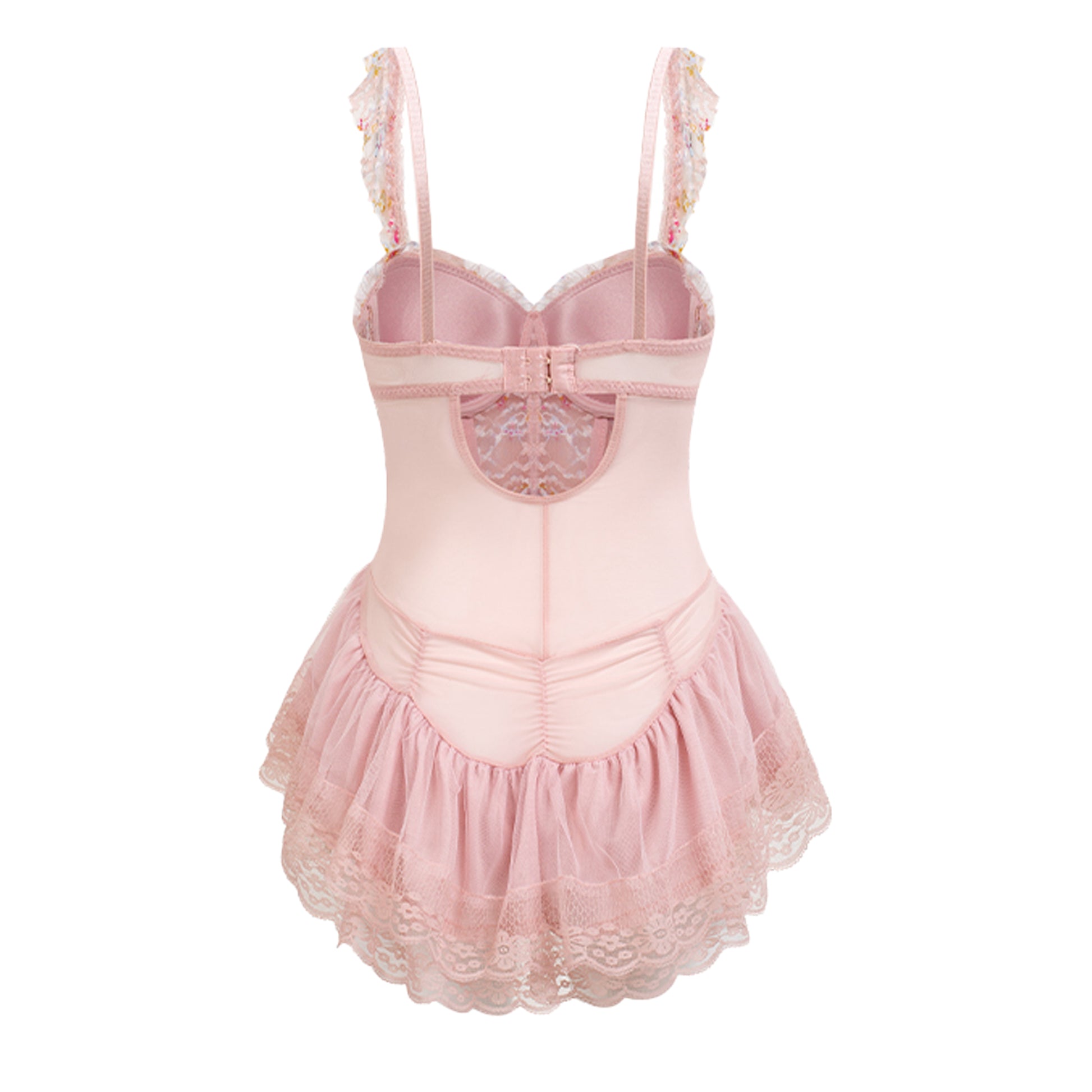 Romantic, feminine, and undeniably sultry. This pink lace bodysuit features delicate floral embroidery, built-in padding for gentle lift, and soft ruffled trim that flatters the silhouette. Comes with a matching lace thong to complete the look.