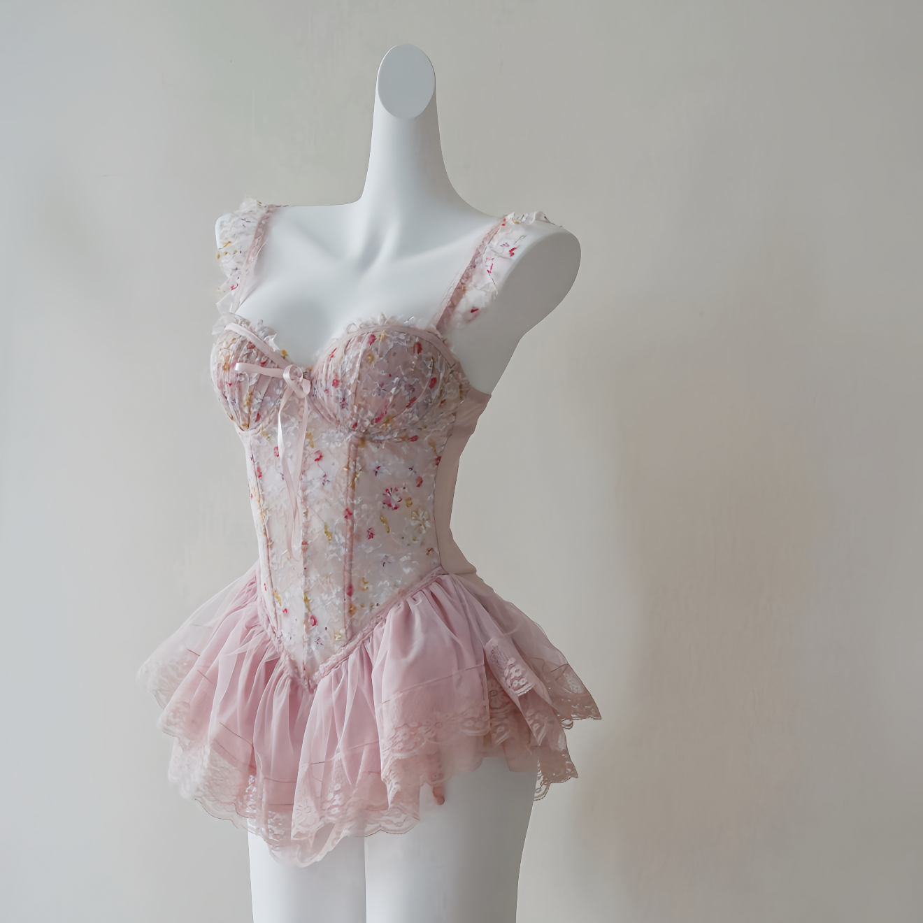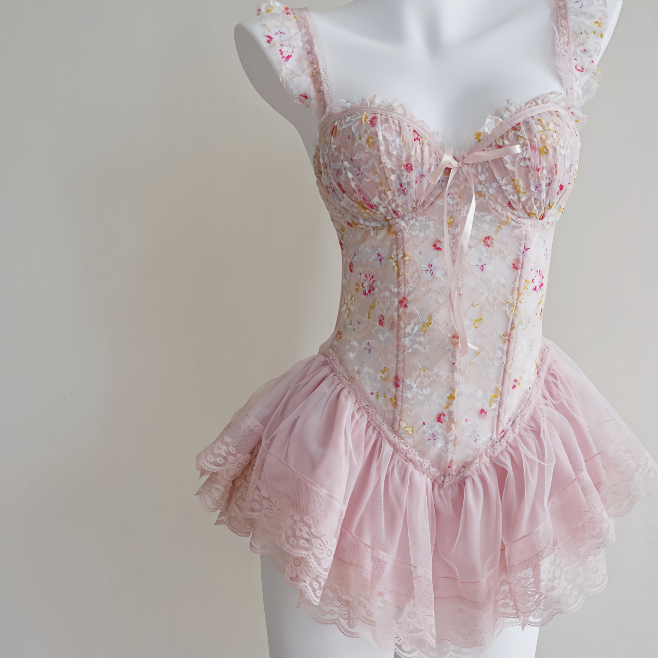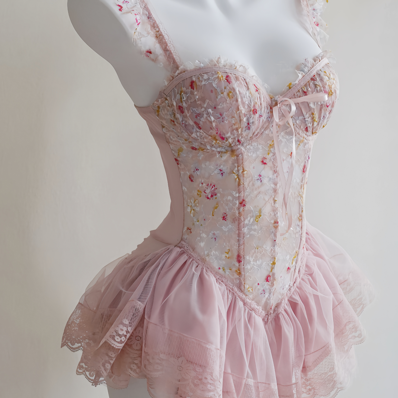 Romantic, feminine, and undeniably sultry. This pink lace bodysuit features delicate floral embroidery, built-in padding for gentle lift, and soft ruffled trim that flatters the silhouette. Comes with a matching lace thong to complete the look.