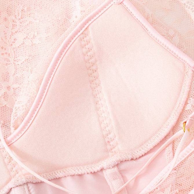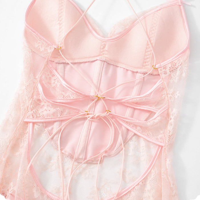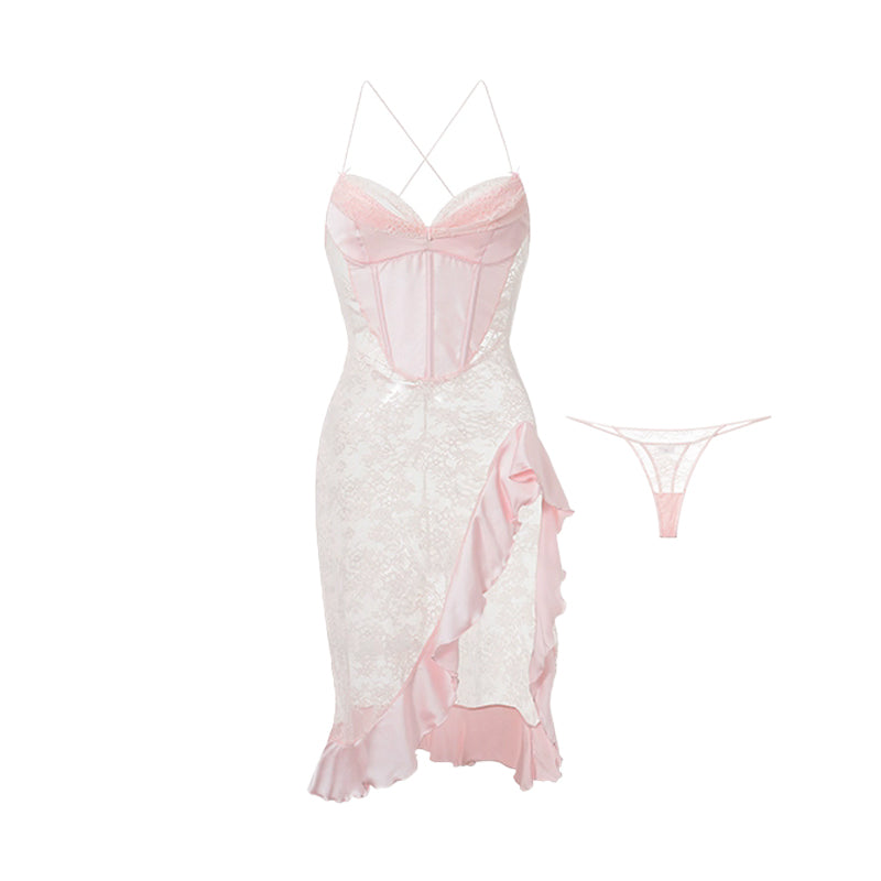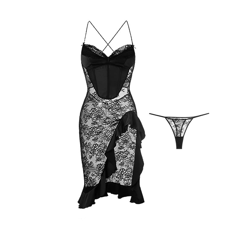 The bust features butterfly-shaped stitching for a refined contour, paired with a subtle ruffle hem that dances with each step. A matching lace thong completes the set for a coordinated, sensual look.
