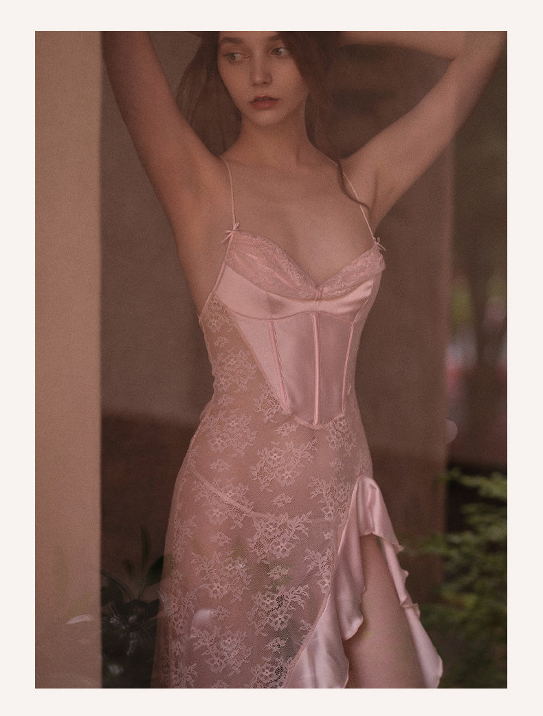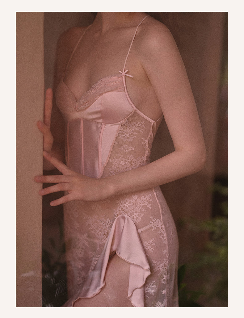 This romantic two-piece nightdress set brings together silky fabrics and delicate lace in a flattering silhouette. The soft cups offer gentle support without an underwire, while the flowy skirt drapes along the body with a high slit that enhances movement and allure.